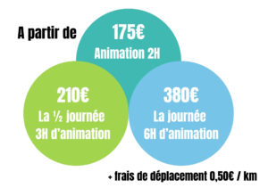 - Durée des animations : de 2H00, 2h30 ou 3h pour la demi-journée et 5h à 6h pour la journée / selon l’âge et votre disponibilité horaire.